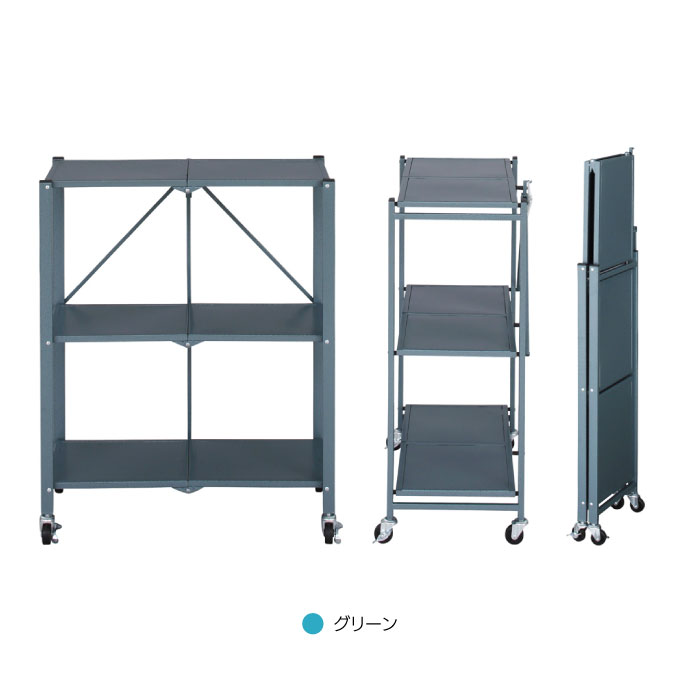 商品名 フォールディングシェルフ 2D キャスター付 カラー グリーン/ブラック 素 材 スチール(粉体塗装)ハンマートーン仕上げ サイズ W71.5×D38.5×H87.5cm 配送について ※こちらの商品はメーカー直送の為、代引でのお取扱いができません。